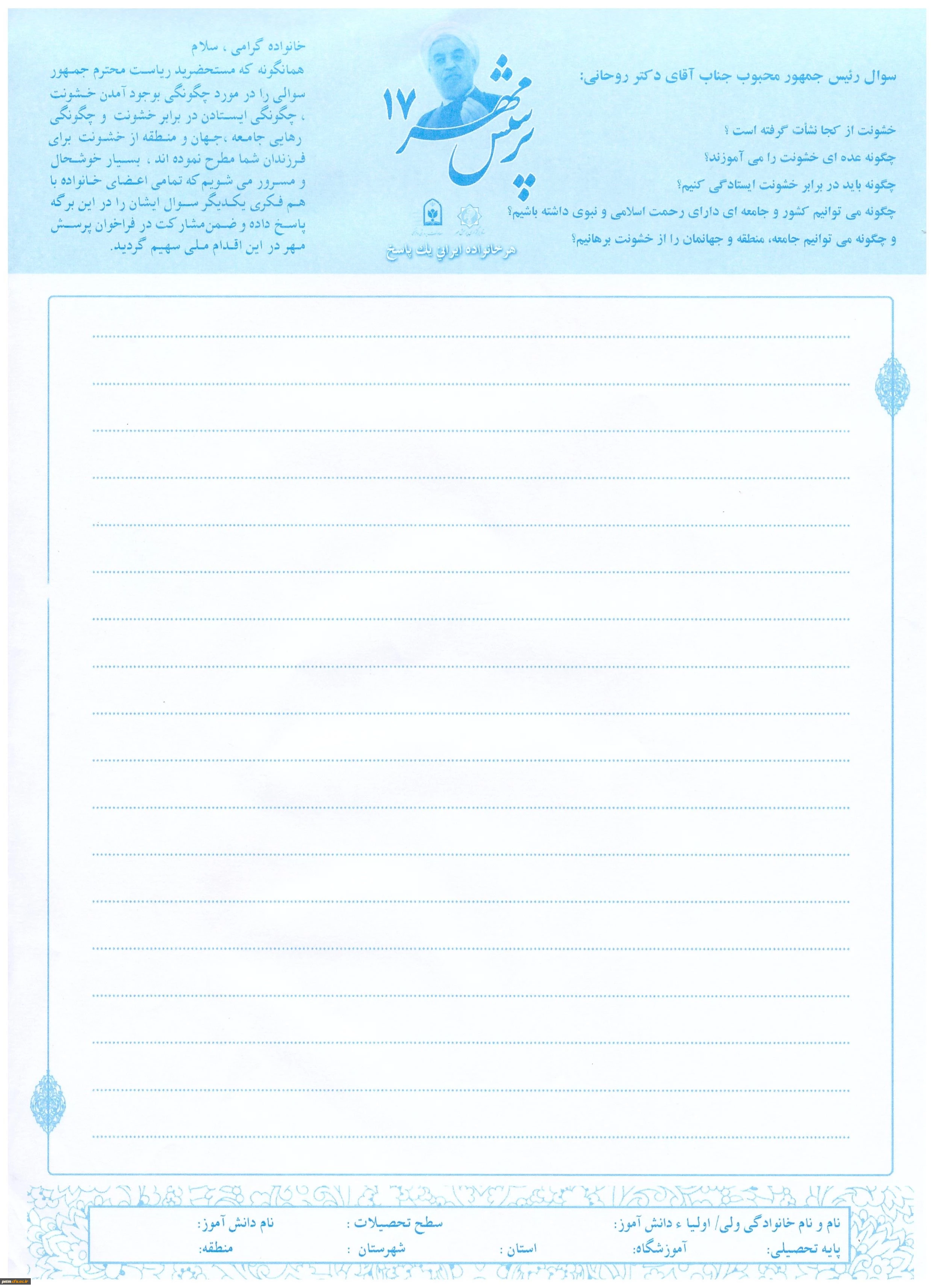 امتیاز دهید : هفدهمین دوره پرسش مهر ریاست محترم جمهوری (مهلت ارسال آثار 25 آذرماه) 2 جمعه 14 آبان 1395 ساعت 9:05