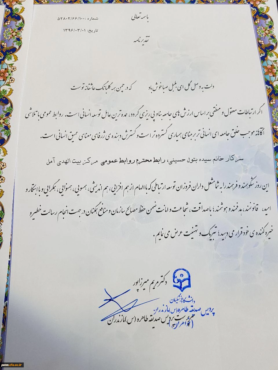 امتیاز دهید : تقدیر وتشکر سرپرست پردیس از تلاش های ارزنده حوزه روابط عمومی پردیس و مراکز تابعه 5 دوشنبه 1 خرداد 1396 ساعت 20:07