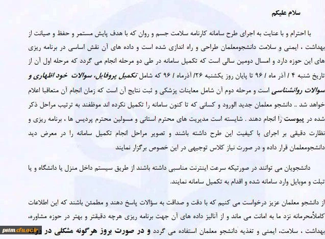 قابل توجه دانشجومعلمان جدیدالورود و افرادی که موفق به تکمیل سامانه سلامت نشده اند: تکمیل سامانه سلامت در مرحله اول حداکثر تا پایان روز یکشنبه 26 آذر ماه 2