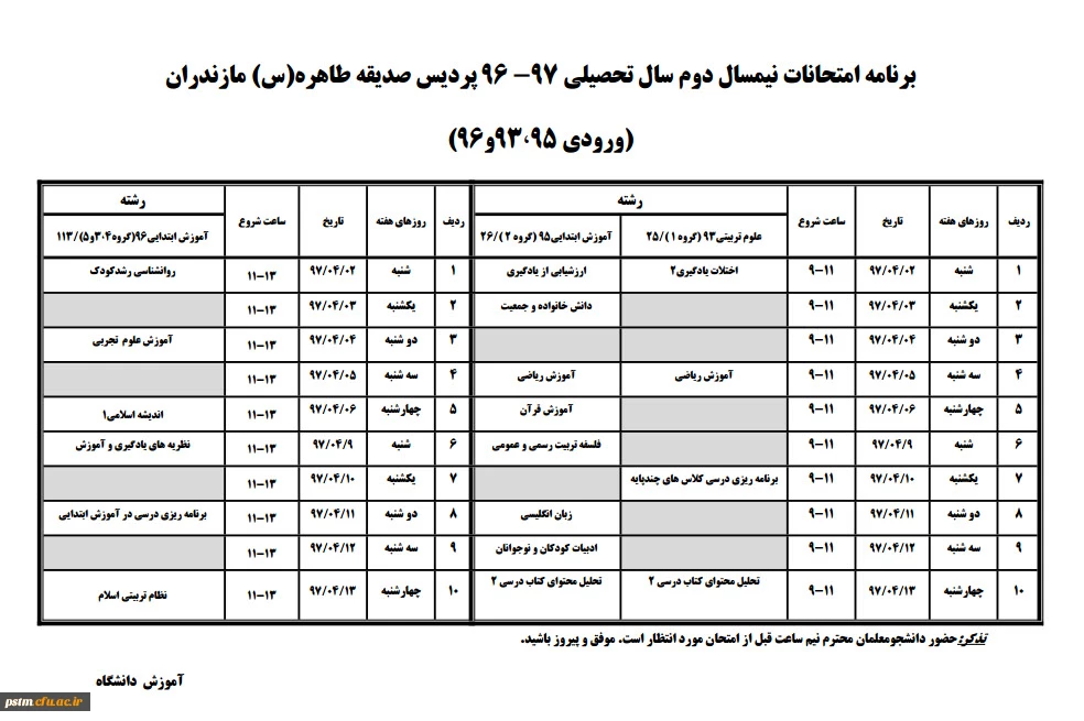 برنامه امتحانی نیمسال دوم 97-1396