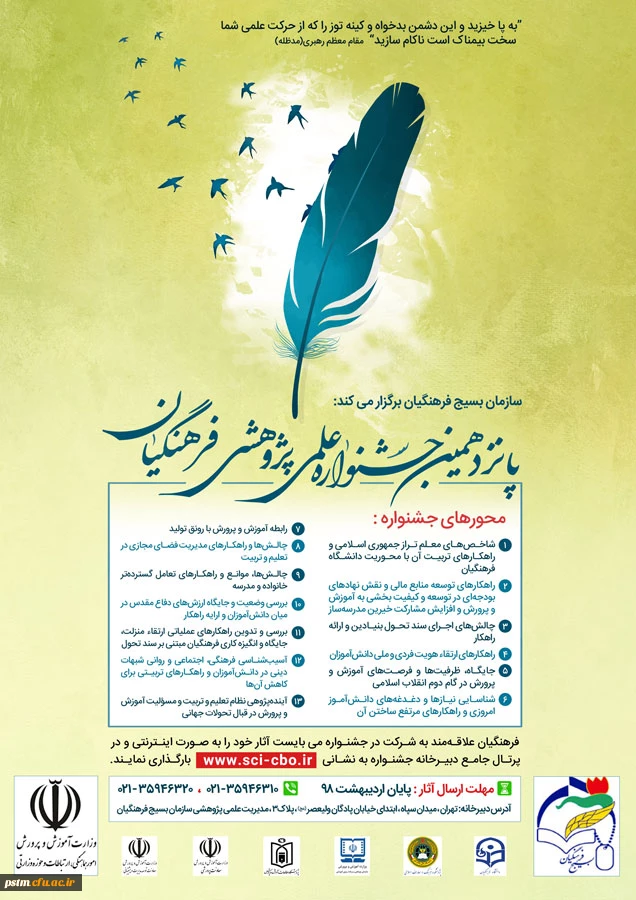 امتیاز دهید : فراخوان پانزدهمین جشنواره علمی پژوهشی فرهنگیان بسیجی - اردیبهشت 98 شنبه 21 اردیبهشت 1398 ساعت 9:11